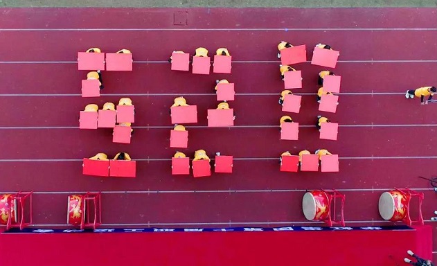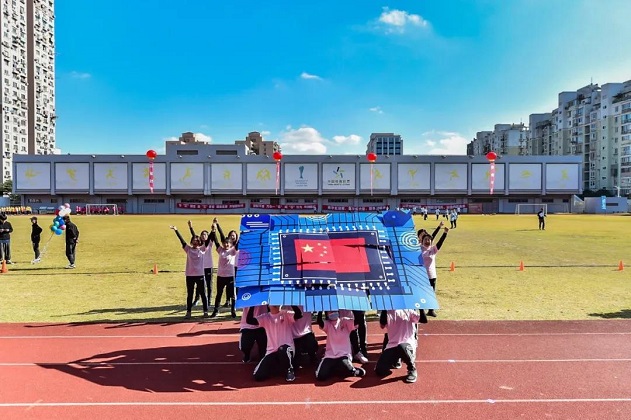此时绿茵场上,方阵队伍列队完毕,操场上摆出巨型芯片造型,动作整齐划一,场面生动震撼。