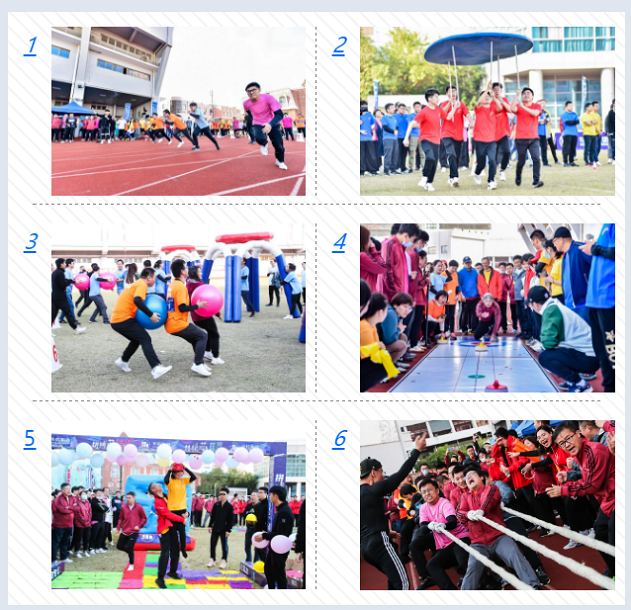本届运动会共设有六大比赛项目,分别为华虹速度(100米跑步),顶立“芯”天地(5人撑杆顶盘跑),同“芯”同行(5人联合运球投篮),一片冰“芯”(旱地冰壶),砥砺前行(8人大型组合接力)及众志成“芯”(多股拔河),各队队员们凝心聚力、团结一心、奋发拼搏,赛出风格,赛出水平。